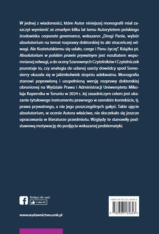 W jednej z wiadomości, które Autor niniejszej monografii miał zaszczyt wymienić ze zmarłym kilka lat temu Autorytetem polskiego środowiska corporate governance, wskazano: „Drogi Panie, wybór absolutorium na temat rozprawy doktorskiej to akt straceńczej odwagi. Ale Kozietulskiemu się udało, czego i Panu życzę”. Książka pt. Absolutorium w polskim prawie prywatnym jest rezultatem wspomnianej odwagi, a do oceny Szanownych Czytelników i Czytelniczek pozostaje to, czy analogia do udanej szarży dowódcy spod Somosierry okazała się w jakimkolwiek stopniu adekwatna. Monografia stanowi poprawioną i uzupełnioną wersję rozprawy doktorskiej obronionej na Wydziale Prawa i Administracji Uniwersytetu Mikołaja Kopernika w Toruniu w 2024 r. Jej zasadniczym celem jest ukazanie tytułowego instrumentu prawnego w szerokim kontekście, tj. prawa prywatnego, a nie jego poszczególnych gałęzi. Takie ujęcie absolutorium, w ocenie Autora właściwe, nie doczekało się jeszcze opracowania w literaturze przedmiotu. Względy te stanowiły podstawową motywację do podjęcia wskazanej problematyki.