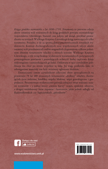 Księga grodzka oszmiańska z lat 1650-1719. Testamenty to pierwsza edycja aktów ostatniej woli wniesionych do ksiąg grodzkich powiatu oszmiańskiego województwa wileńskiego. Stanowi ona jedyny, jak dotąd, przykład prowadzenia na terenach Wielkiego Księstwa Litewskiego ksiąg zawierających tylko testamenty. Ponadto, o ile za sprawą dziewiętnastowiecznych rosyjskich wydawnictw Komisji Archeograficznych oraz współczesnych edycji aktów ostatniej woli przedstawicieli rodów magnackich dysponujemy całkiem pokaźnym zbiorem testamentów szlachty z różnych terenów Wielkiego Księstwa Litewskiego, o tyle wciąż brakuje wydawnictw testamentalnych poświęconych poszczególnym powiatom i pozwalających uchwycić bodaj częściowo dzieje mikroregionu i zamieszkujących go ludzi. Oddawana w ręce czytelników publikacja ma choć po trosze wypełnić tę lukę. Jej wagę podkreśla fakt, że udostępniane materiały nie były wcześniej ogłoszone drukiem.