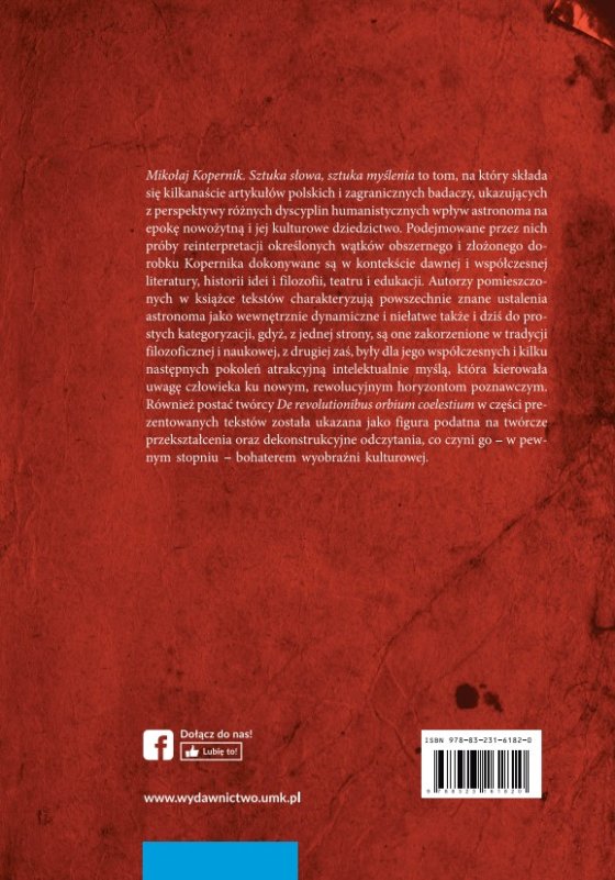 Mikołaj Kopernik. Sztuka słowa, sztuka myślenia to tom, na który składa się kilkanaście artykułów polskich i zagranicznych badaczy, ukazujących z perspektywy różnych dyscyplin humanistycznych wpływ astronoma na epokę nowożytną i jej kulturowe dziedzictwo. Podejmowane przez nich próby reinterpretacji określonych wątków obszernego i złożonego dorobku Kopernika dokonywane są w kontekście dawnej i współczesnej literatury, historii idei i filozofii, teatru i edukacji. Autorzy pomieszczonych w książce tekstów charakteryzują powszechnie znane ustalenia astronoma jako wewnętrznie dynamiczne i niełatwe także i dziś do prostych kategoryzacji, gdyż, z jednej strony, są one zakorzenione w tradycji filozoficznej i naukowej, z drugiej zaś, były dla jego współczesnych i kilku następnych pokoleń atrakcyjną intelektualnie myślą, która kierowała uwagę człowieka ku nowym, rewolucyjnym horyzontom poznawczym. Również postać twórcy De revolutionibus orbium coelestium w części prezentowanych tekstów została ukazana jako figura podatna na twórcze przekształcenia oraz dekonstrukcyjne odczytania, co czyni go – w pewnym stopniu – bohaterem wyobraźni kulturowej.