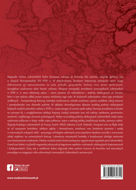 Magnacka rodzina Lubomirskich herbu Szreniawa, należąca do koronnej elity państwa, odegrała ogromną rolę w dziejach Rzeczypospolitej XVI–XVIII w. W dotychczasowej literaturze historycznej poświęcano sporo uwagi dokonaniom jej reprezentantów na polu polityki, gospodarki, kultury oraz spraw społecznych. Szczegółowo analizowano także kwestie rodzinne. Niniejsza monografia przedstawia poszczególnych Lubomirskich w XVIII w. w nieco odmiennej optyce – przez pryzmat ich wykształcenia i podróży edukacyjnych po Europie, które w tym stuleciu odbyli prawie wszyscy młodzieńcy tego rodu. W badaniach wykorzystano różne typy przekazów źródłowych – korespondencję listowną, instrukcje wychowawcze, metryki uczelniane, rejestry wydatków, relacje prasowe i pamiętnikarskie oraz dzienniki podróży. W układzie chronologicznym ukazano przebieg podróży edukacyjnych kolejnych męskich potomków rodziny w XVIII w., rozpoczynając od zarania epoki saskiej. Narracja przedstawia te kwestie na szerszym tle, z uwzględnieniem edukacji krajowej, tradycji antenatów oraz roli rodziny, opiekunów, guwernerów, mentorów i najbliższego otoczenia podróżujących. Wpływ na przebieg podróży edukacyjnych Lubomirskich miały ważne wydarzenia polityczne w kraju: wielka wojna północna, wojna o sukcesję polską, konfederacja barska, pierwszy rozbiór. Wyjazdy kształcące Lubomirskich do Francji, Austrii, Włoch, Saksonii, Czech, Holandii i Szwajcarii oraz na Śląsk miały za cel nawiązanie kontaktów, zdobycie ogłady i doświadczenia, zwiedzanie oraz kształcenie prywatne i naukę w różnorodnych rodzajach szkół – poczynając od kolegiów zakonnych, przez popularne akademie rycerskie i nowoczesne szkoły wojskowe, na uniwersytetach kończąc. Lubomirscy utrzymywali kontakty z koryfeuszami ideologii oświecenia oraz towarzystwami naukowymi. Osobny rozdział został również poświęcony zagranicznym wyjazdom pań Lubomirskich. Grand tour kobiet z tej familii magnackiej odznaczał się bogactwem aspektów: rodzinnych, edukacyjnych, krajoznawczych i kolekcjonerskich. Dużą rolę w mobilności kobiet odgrywały także podróże lecznicze do kurortów wód mineralnych pozwalające na osiągnięcie celów zdrowotnych, towarzyskich, kulturalnych i poznawczych.