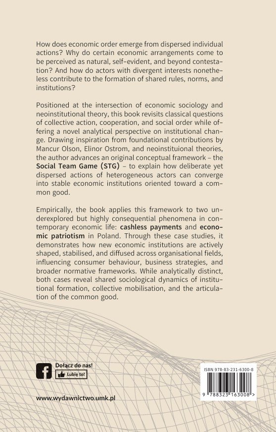 Empirically, the book applies this framework to two underexplored but highly consequential phenomena in contemporary economic life: cashless payments and economic patriotism in Poland. Through these case studies, it demonstrates how new economic institutions are actively shaped, stabilised, and diffused across organisational fields, influencing consumer behaviour, business strategies, and broader normative frameworks. While analytically distinct, both cases reveal shared sociological dynamics of institutional formation, collective mobilisation, and the articulation of the common good.