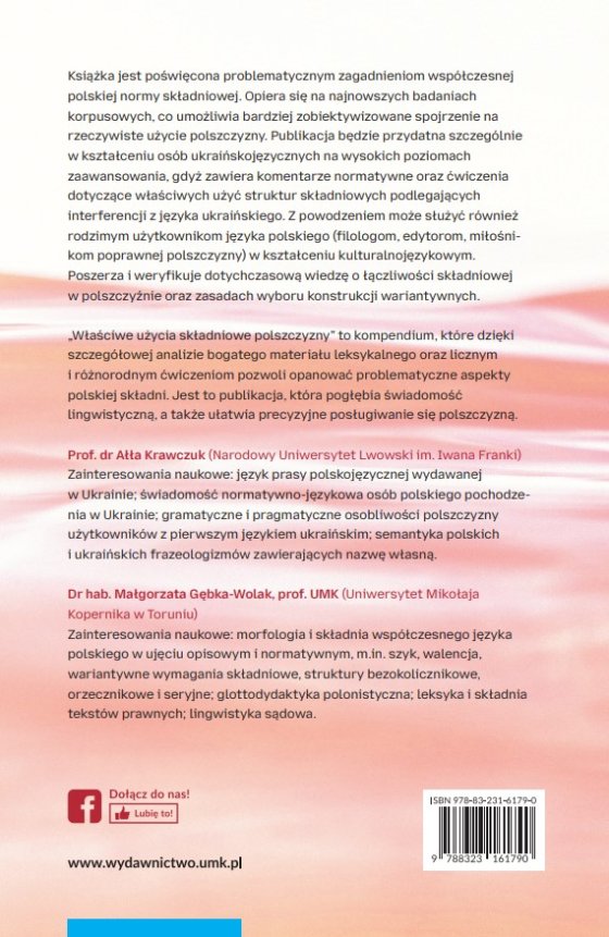 Książka jest poświęcona problematycznym zagadnieniom współczesnej polskiej normy składniowej. Opiera się na najnowszych badaniach korpusowych, co umożliwia bardziej zobiektywizowane spojrzenie na rzeczywiste użycie polszczyzny. Publikacja będzie przydatna szczególnie w kształceniu osób ukraińskojęzycznych na wysokich poziomach zaawansowania, gdyż zawiera komentarze normatywne oraz ćwiczenia dotyczące właściwych użyć struktur składniowych podlegających interferencji z języka ukraińskiego. Z powodzeniem może służyć również rodzimym użytkownikom języka polskiego (filologom, edytorom, miłośnikom poprawnej polszczyzny) w kształceniu kulturalnojęzykowym. Poszerza i weryfikuje dotychczasową wiedzę o łączliwości składniowej w polszczyźnie oraz zasadach wyboru konstrukcji wariantywnych.