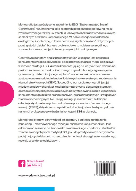 Centralnym punktem analiz przedstawionych w książce jest percepcja konsumentów wobec aktywności podejmowanych przez marki odzieżowe w ramach strategii ESG. Autorki koncentrują się na wpływie tych działań na poziom zaufania do marki – kluczowego czynnika budującego relacje na rynku mody i determinującego lojalność wobec marek. W opracowaniu zastosowano metodologię badań ilościowych wykorzystującą modelowanie równań strukturalnych (SEM). Szczególną wartością monografii jest jej międzynarodowy charakter. Analiza komparatywna dostarcza istotnych dowodów empirycznych wskazujących na występowanie różnic w podejściu konsumentów do działań prospołecznych, prośrodowiskowych i związanych z ładem korporacyjnym. Na uwagę zasługuje również fakt, że książka odwołuje się do aktualnych standardów raportowania zrównoważonego rozwoju (ESRS), dzięki czemu wyniki badań wpisują się w bieżące dyskusje na temat praktycznego wdrażania koncepcji ESG w biznesie.