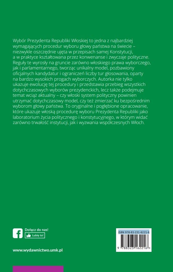 Wybór Prezydenta Republiki Włoskiej to jedna z najbardziej wymagających procedur wyboru głowy państwa na świecie – niezwykle oszczędnie ujęta w przepisach samej Konstytucji, a w praktyce kształtowana przez konwenanse i zwyczaje polityczne. Reguły te wyrosły na gruncie zarówno włoskiego prawa wyborczego, jak i parlamentarnego, tworząc unikalny model, pozbawiony oficjalnych kandydatur i ograniczeń liczby tur głosowania, oparty na bardzo wysokich progach wyborczych. Autorka nie tylko ukazuje ewolucję tej procedury i przedstawia przebieg wszystkich dotychczasowych wyborów prezydenckich, lecz także podejmuje temat wciąż aktualny – czy włoski system polityczny powinien utrzymać dotychczasowy model, czy też zmierzać ku bezpośrednim wyborom głowy państwa. To oryginalne i pogłębione opracowanie, które ukazuje włoską procedurę wyboru Prezydenta Republiki jako laboratorium życia politycznego i konstytucyjnego, w którym widać zarówno trwałość instytucji, jak i wyzwania współczesnych Włoch.