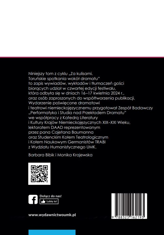 Niniejszy tom z cyklu „Za kulisami. Toruńskie spotkania wokół dramatu”to zapis wywiadów, wykładów i tłumaczeń gości biorących udział w czwartej edycji festiwalu, która odbyła się w dniach 16–17 kwietnia 2024 r., oraz osób zaproszonych do współtworzenia publikacji. Wydarzenie poświęcone dramatowi i teatrowi niemieckojęzycznemu przygotował Zespół Badawczy „Performatyka i Studia nad Przekładem Dramatu” we współpracy z Katedrą Literatury i Kultury Krajów Niemieckojęzycznych XIX–XXI Wieku, lektoratem DAAD reprezentowanym przez pana Cajetana Baumanna oraz Studenckim Kołem Teatrologicznym i Kołem Naukowym Germanistów TRABI z Wydziału Humanistycznego UMK.